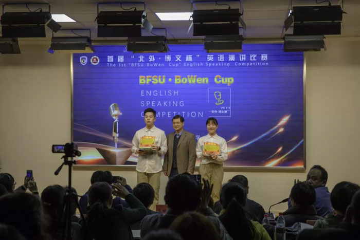 随后,北外外教Kirschbaum也登台发表感言,他首先赞美了同学们的勇气和自信,并鼓励同学们更努力地去学习,做到每天进步一点点。
