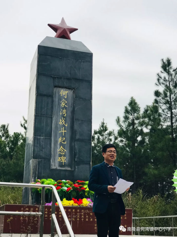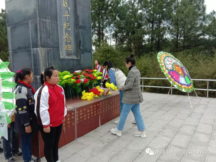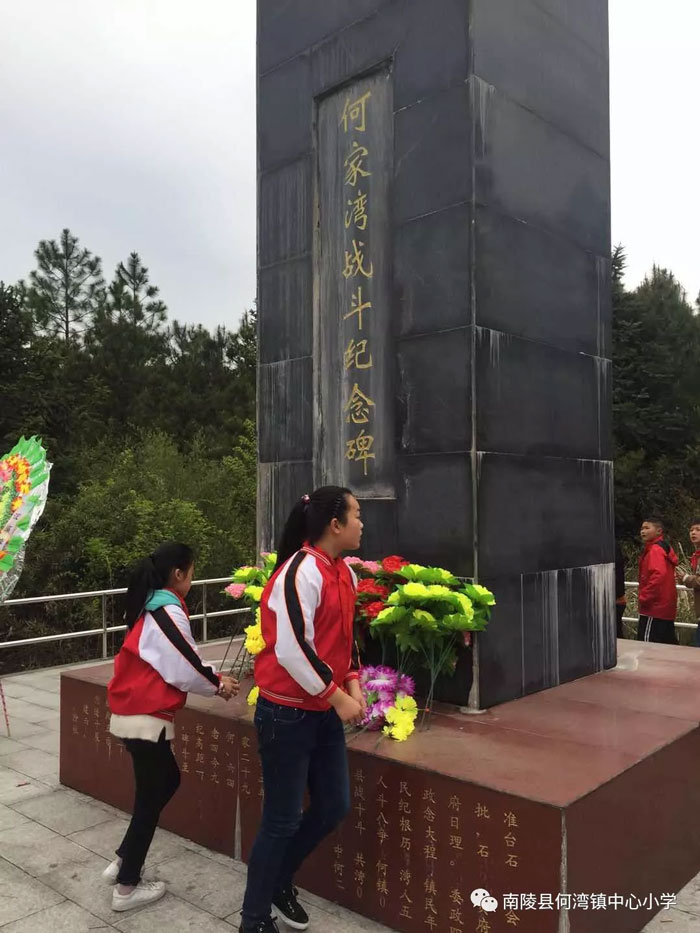 抬头是高耸的何家湾烈士纪念碑,低头是一级级的青石板。拾级而上,手里的花束寄托心里的敬畏与哀思。课堂上的故事,书本里的人物,此刻历史的气息铺面而来,带着战场上的腥风血雨,带着字句中的铮铮傲骨。我们高高捧起、献上的不仅是花束,更是对烈士们英勇献身的无限崇敬之情。