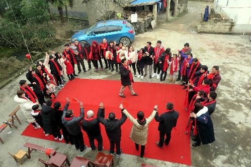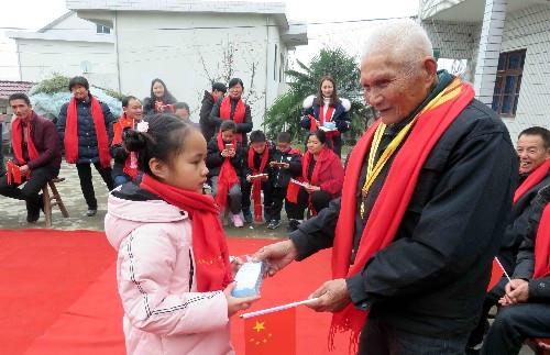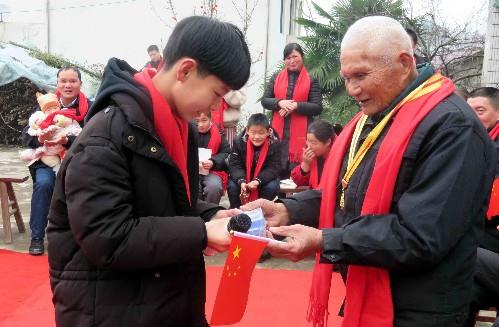 当天,方继来爷爷家的院子里热热闹闹,儿孙们系着喜庆的红围巾,围拢在一起,齐声高唱着红色革命歌曲,大家在一起表演节目,不大的农家小院欢歌笑语不断。