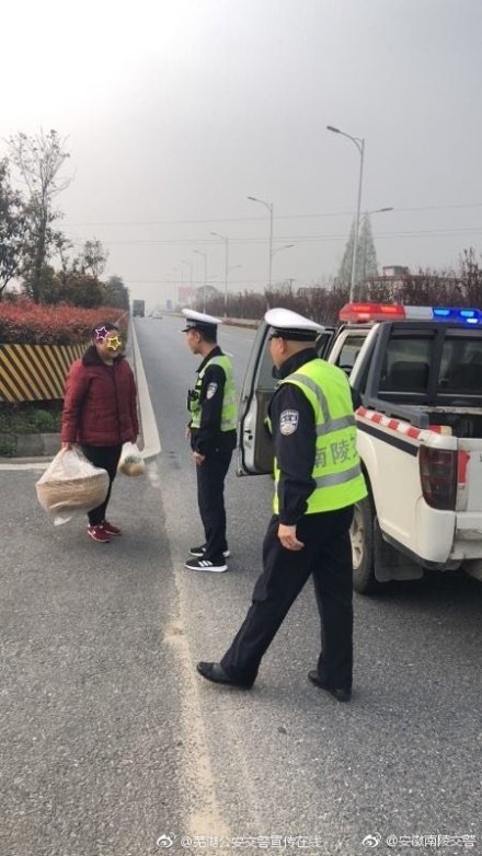 3月30日上午八点多,交警南陵大队在芜湖至南陵的快速通道上巡逻。巡逻到大浦附近时,发现一老妪拎着东西在快速车道的里侧蹒跚地走着,不时地停下来,一副茫然的样子。