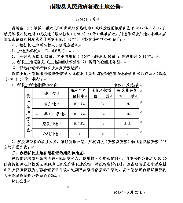 南陵县人民政府征收土地公告[2015]9号