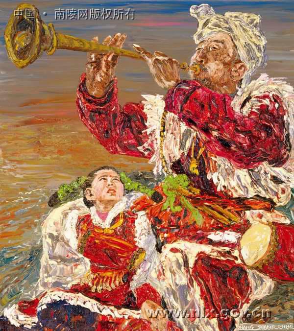 画者通过陕北老汉、唢呐、白羊肚毛巾、腰鼓及老汉身旁的小孙女等具象的刻画;同时加以红、黄、蓝、绿、白等强烈的色彩意象渲染,构成整个画面的视觉张力,从而完成从具象到意象,再从意象到具象即从三维到四维的时空穿越。