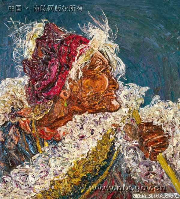画面中一位手握竹杖年近七旬的藏族老婆婆,粉红色的头巾,雪白的羊皮袄翻领和苍白的头发,古铜色的脸庞和粗糙的手,整个画面色彩绚丽饱满,形成一种强大的色彩视觉冲击力,给观者的是一种心灵震撼的色彩美感!画面中人物的造型有如石雕刀刻,从而展现出人物坚毅的性格,满是皱纹的脸庞和紧握竹杖的手预示着画中人物沧桑的人生历程,老婆婆深邃的眼睛及凝视远方的目光则体现出画中人物一往无前终生无悔的执著精神。观者看到的是一个真实的人物具象,但画者并未仅仅停留在色彩美和人物真实的艺术直观表层上,张尚明通过强烈的色彩视觉和人物的真实刻画在更深层面上表达着一种绘画的意象,使观者在潜意识中产生一种心灵意象的碰撞,画中人物那种坚毅的性格,那种对信仰的执著追求也许正是画者本人心迹意象的自然流露。