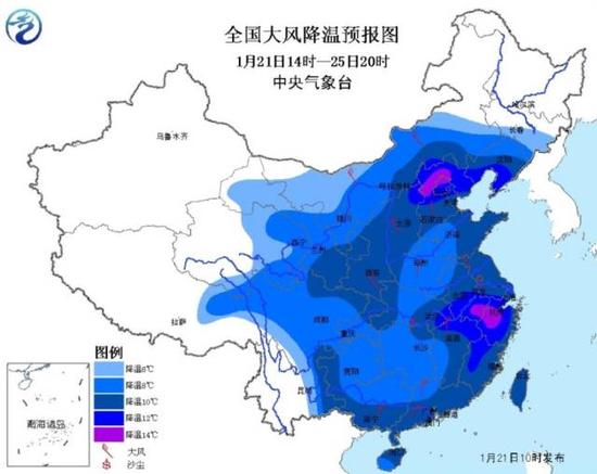 中央气象台今天继续发布寒潮蓝色预警,21日至25日,我国中东部地区局地降温可达12~14℃;长江中下游地区最低气温将下降至-10℃左右,0℃线将南压至华南中部一带;广东北部等地的局部地区最低气温或突破历史极值。